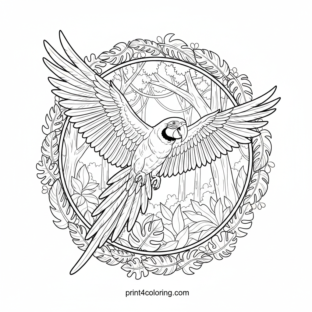 Rainforest Regent: Soaring Macaw's Grand Flight Coloring Page