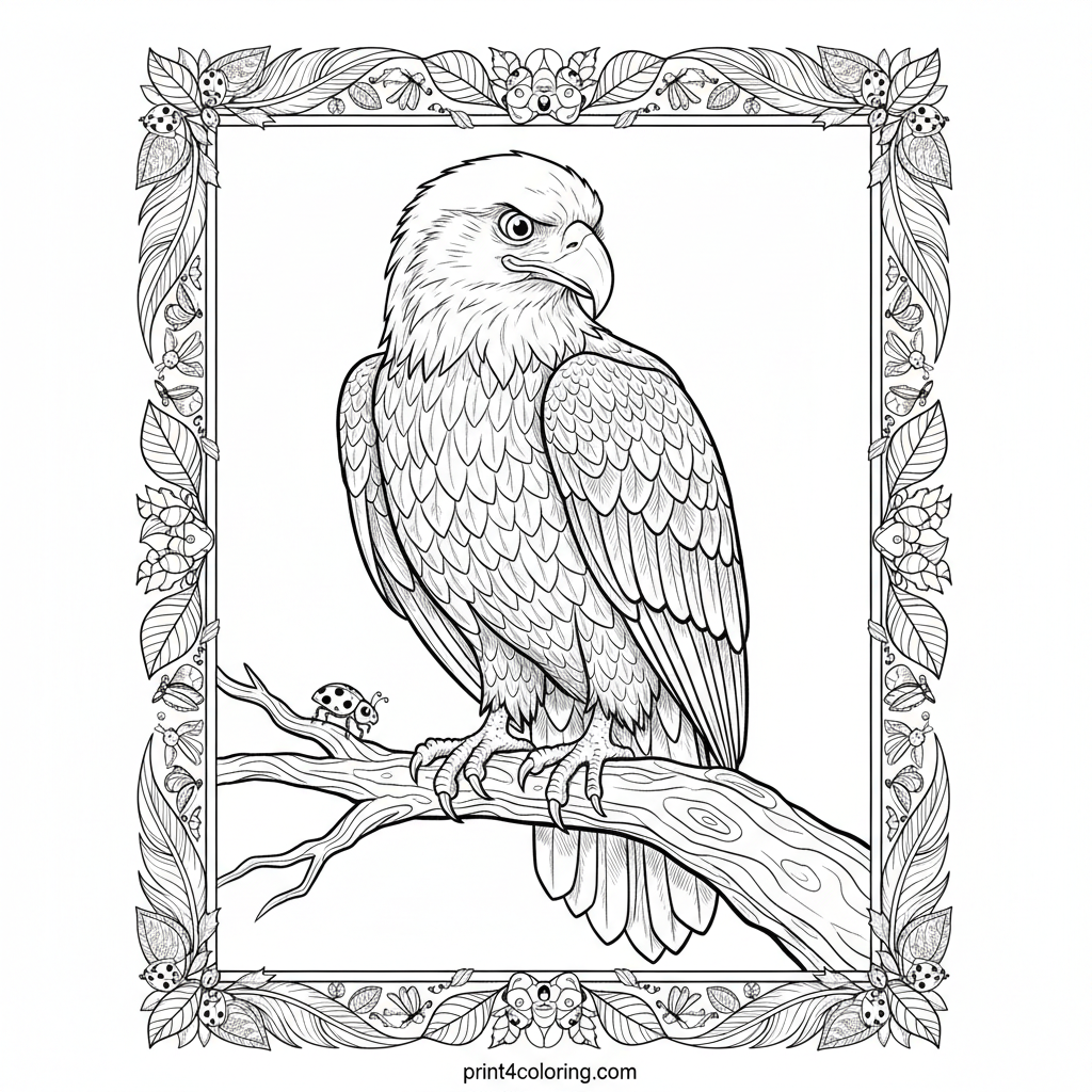 A magnificent eagle, perched majestically on a sturdy tree branch, discovers a delightful surprise! A tiny, brave ladybug is slowly making its way up one of the eagle's strong talons, catching the big bird's eye with a look of gentle curiosity. Bring this heartwarming moment to life with your colors!