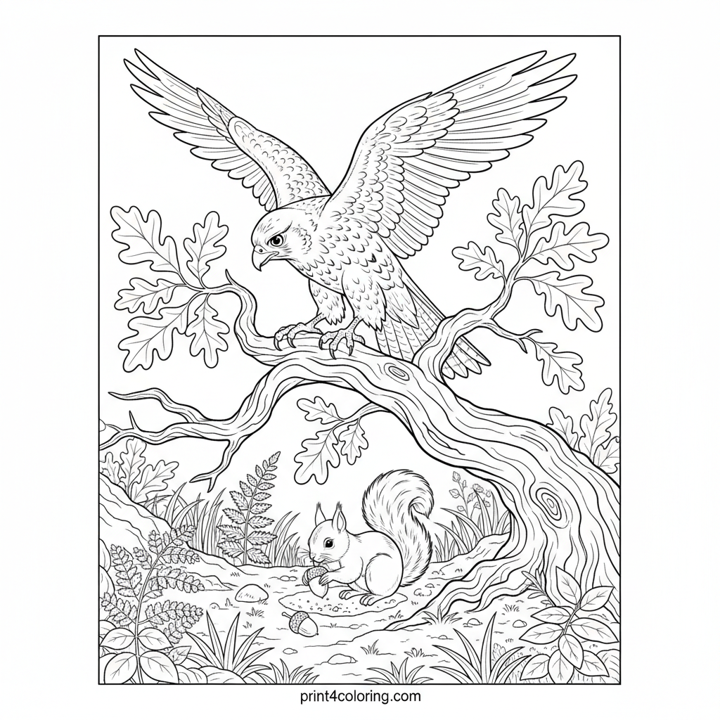 Observe a majestic falcon perched on a gnarled oak branch, its sharp gaze fixed on a tiny squirrel diligently burying an acorn below. This intricate scene invites you to color every detail, from the ancient bark and lush leaves to the hidden forest undergrowth, capturing a moment of intense focus in nature.