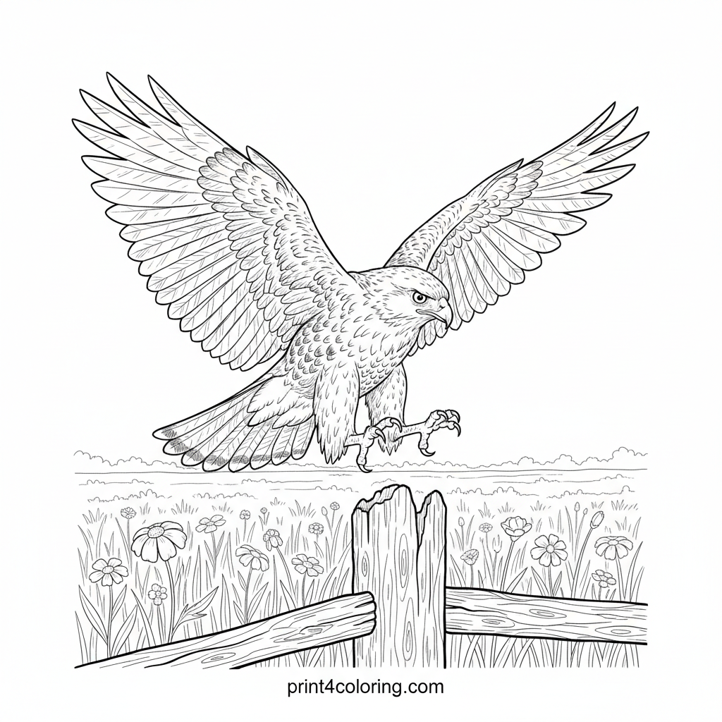 Observe a magnificent hawk perched on an old fence post, its sharp eyes scanning a vibrant meadow below. This detailed scene invites you to bring its intricate feathers, the delicate wildflowers, and the rustic wood to life with your favorite colors. Imagine the quiet power of this incredible bird!