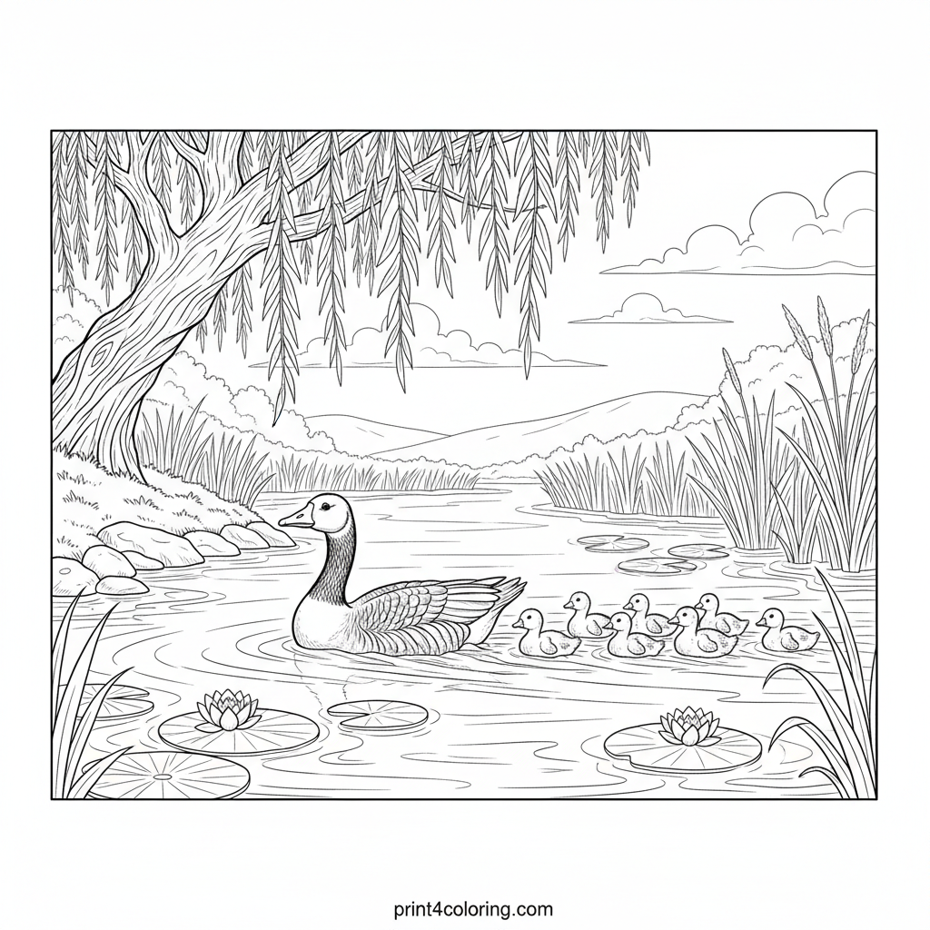 Dive into a beautiful riverside scene featuring a loving mother goose and her five unique goslings enjoying a peaceful swim. Explore the intricate details of tall reeds, delicate water flora, and the textured bark of a leaning willow tree, all waiting for your artistic touch.