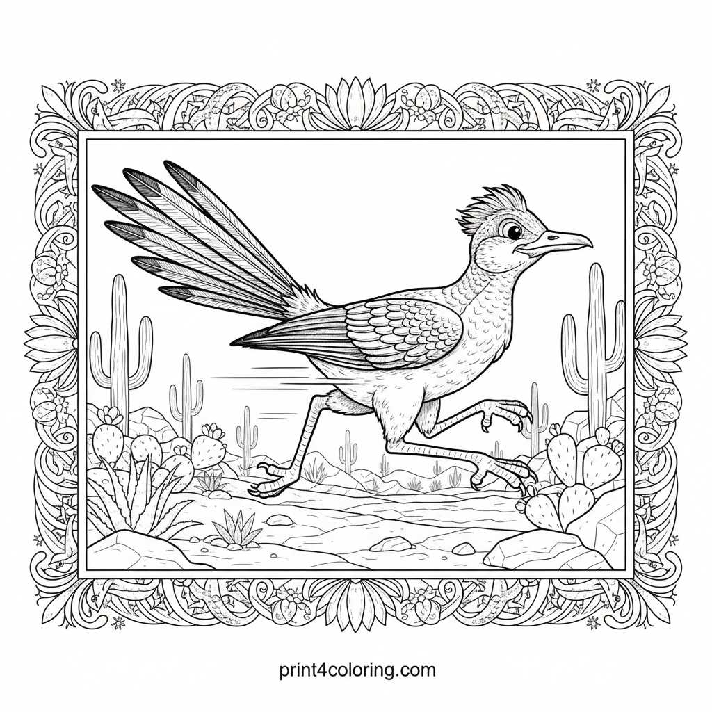 Experience the thrill of the desert with this powerful roadrunner in full stride! Watch its long tail feathers stream as it races across a rocky path, surrounded by detailed desert plants. This expert-level page captures the speed and spirit of the iconic desert bird, ready for your vibrant colors.