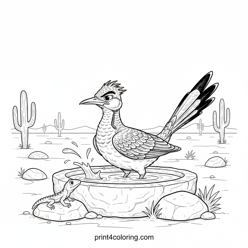 Dive into the desert with a hilarious roadrunner enjoying a tiny, rustic stone bird bath! Watch as it playfully splashes water with a wing, while a curious lizard peeks from a warm rock. This intricate scene captures a moment of desert fun, perfect for expert colorists to bring to life with vibrant shades.