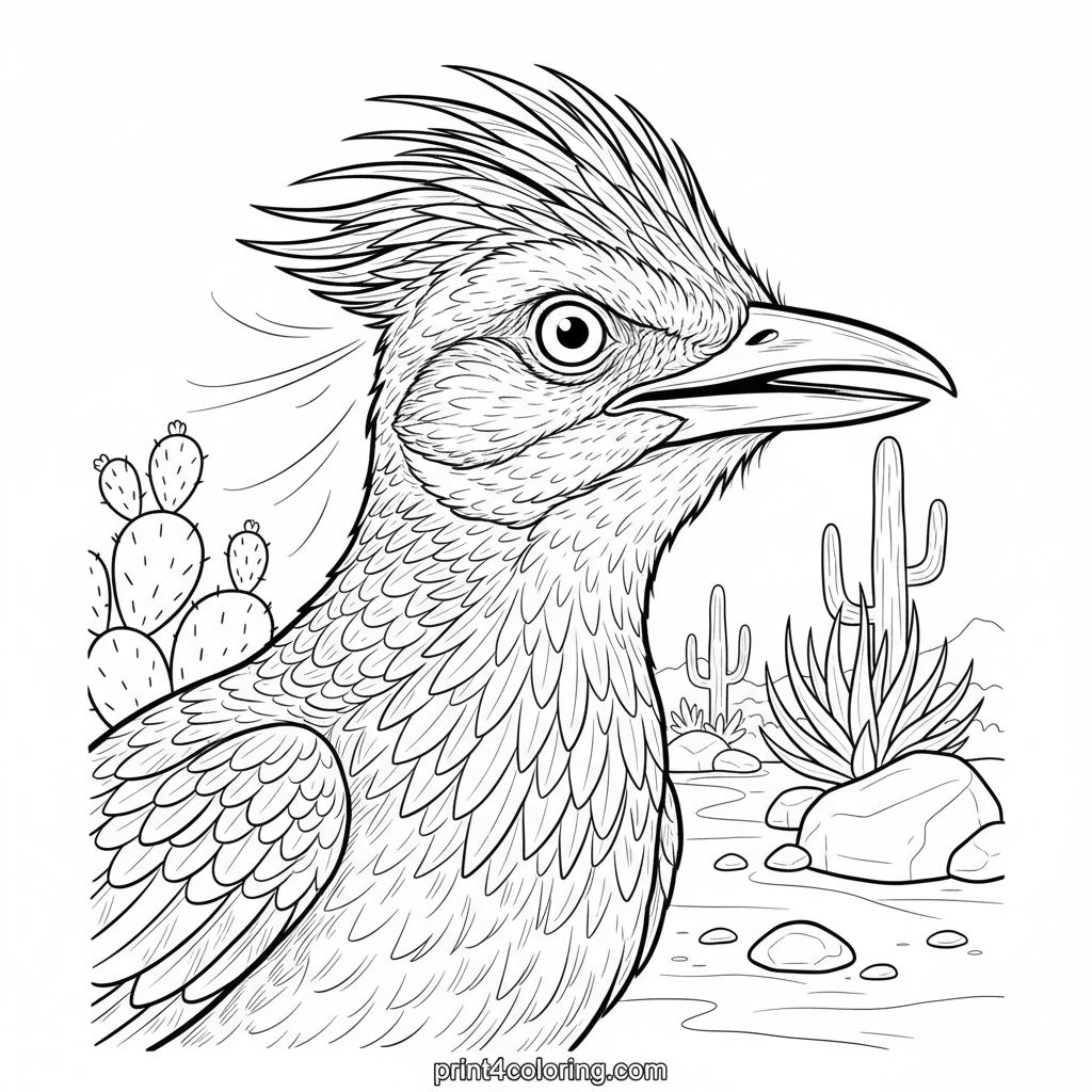 Get ready to color a magnificent roadrunner, caught in a thrilling desert dash! Watch its powerful legs blur and long tail feathers stream as it races across rocky terrain. This detailed scene includes sparse desert plants, perfect for bringing the vibrant desert ecosystem to life with your favorite colors.