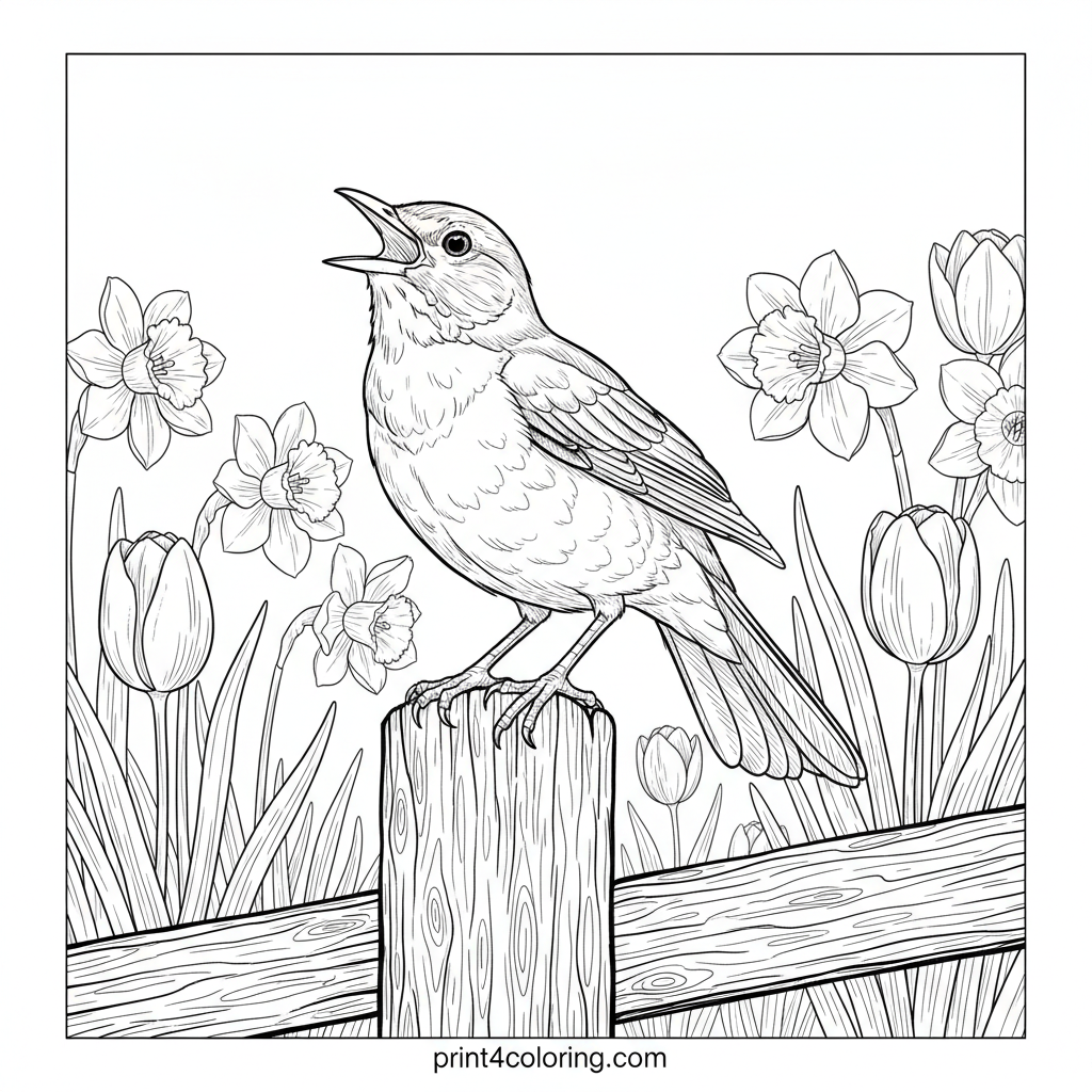 Capture the beauty of a proud robin in full song, perched on an old garden fence post. This intricate scene features a vibrant spring background with blooming daffodils and tulips, bathed in warm sunlight. Perfect for older children and adults who love detailed nature scenes and the joy of springtime.
