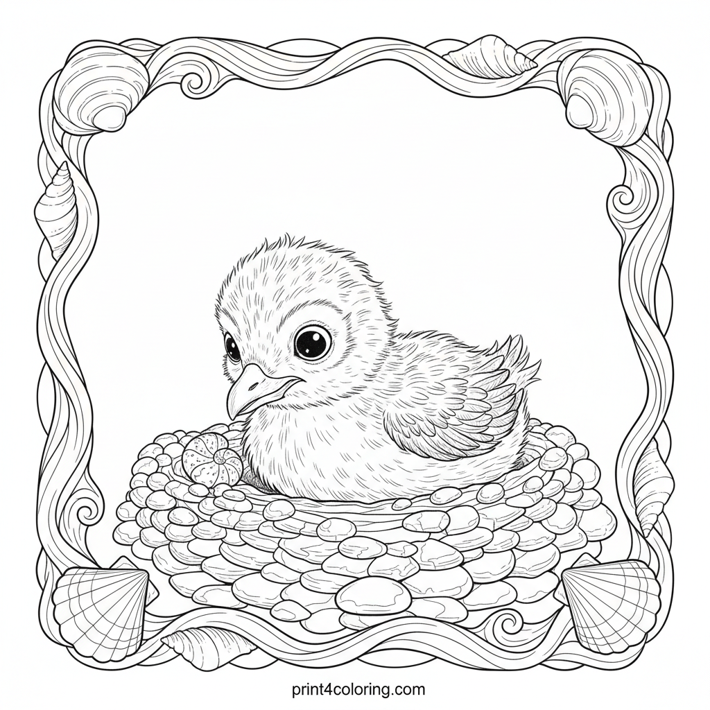 Dive into the world of a fluffy baby seagull chick! With big, curious eyes, this little one peeks out from its cozy, rocky nest, gazing at a tiny seashell. Imagine the vibrant colors of the ocean and sky as you bring this adorable scene to life. What adventures await this curious chick?