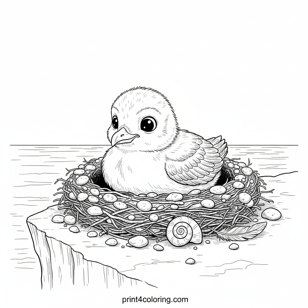 Meet a curious baby seagull chick with big, wondering eyes, peeking out from its cozy, detailed rocky nest. It's captivated by a tiny seashell resting on the edge, ready to discover the wonders of the seaside world. A delightful scene for young artists to bring to life with colors!