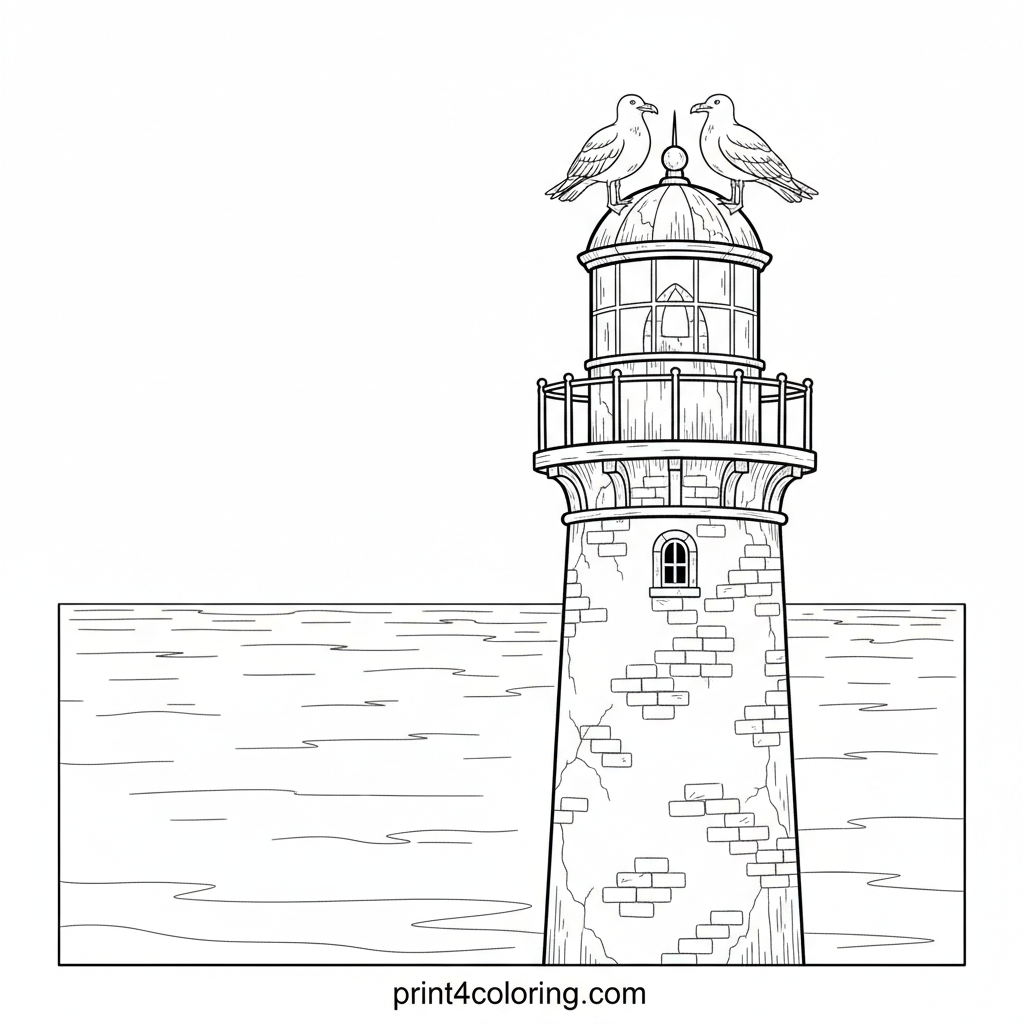 Imagine a peaceful day at the coast! Two friendly seagulls have found the perfect spot to rest on an ancient lighthouse railing. Below them, the ocean sparkles under the sun, inviting you to add vibrant colors to this serene seaside scene. What beautiful shades will you choose for the sky and sea?