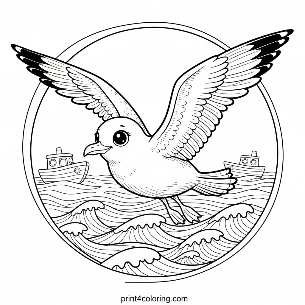 A magnificent seagull, wings fully extended, gracefully soars high above detailed ocean waves. Distant boats dot the horizon. Bring this beautiful coastal scene to life with your favorite colors, capturing the freedom of flight and the vastness of the sea.