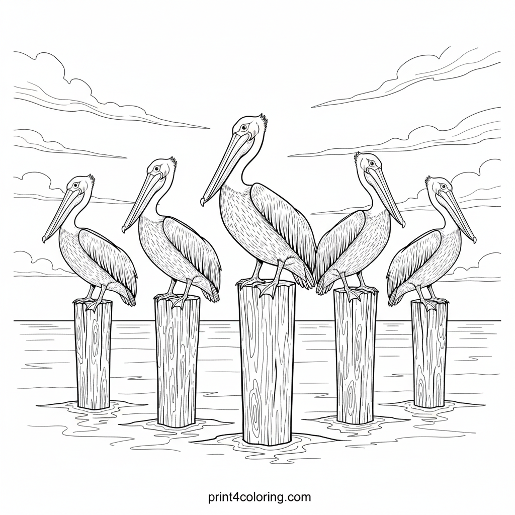 Seaside Serenity: Pelicans on the Old Pier Coloring Page