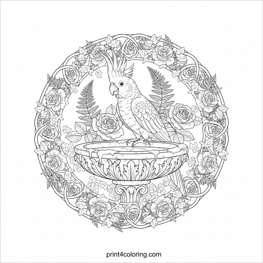 Step into a hidden world with this intricate coloring page! Discover a magnificent Cockatoo perched elegantly on a mossy, carved stone bird bath within a lush secret garden. Surround yourself with vintage roses, delicate ferns, and trailing ivy, bringing to life a scene of historical beauty and natural wonder. A perfect challenge for expert colorists!