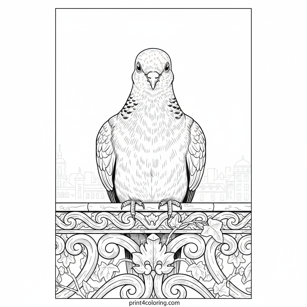 Imagine a beautiful, peaceful dove resting on a grand, old balcony railing. This close-up portrait shows the dove's gentle feathers, intricate stone carvings, and delicate ivy. Look closely for distant city details! A perfect page for expert colorists to bring to life with subtle shades and fine details.