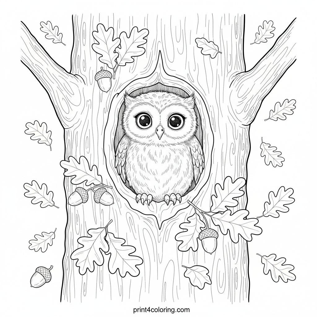 Discover a charming baby owlet, wide-eyed and fluffy, peeking from its snug tree hollow. This delightful scene features intricate details of realistic oak leaves and acorns, inviting young artists to bring the forest's gentle beauty to life with a full spectrum of colors. A perfect challenge for nature lovers!