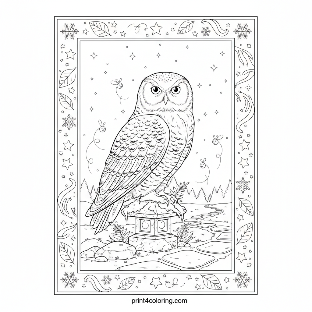 Embark on a magical night adventure with a majestic snowy owl! This intricate page features a wise owl, guarding an ancient, mossy lantern on a winding forest path. Tiny fireflies glow under a starry sky, waiting for you to bring this enchanting scene to life.