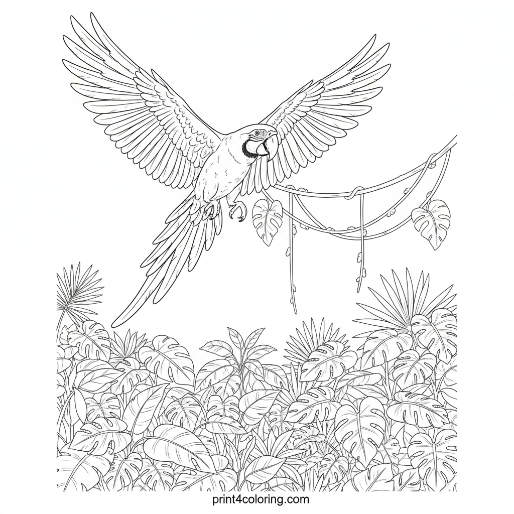 Watch a magnificent macaw take flight, soaring gracefully just above the vibrant, detailed canopy of a tropical rainforest! Its broad wings are outstretched as it glides past hanging vines and unique leaf shapes. Bring this amazing bird and its lush home to life with your favorite colors. A thrilling adventure awaits your crayons!