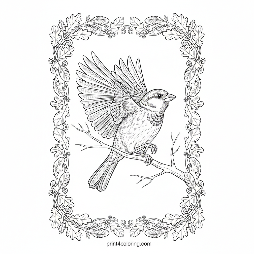 Capture the thrilling moment a graceful sparrow launches into flight! This expert-level coloring page showcases intricate feather details as the bird spreads its wings from a slender branch. Bring this dynamic scene to life with vibrant colors, celebrating the freedom and beauty of nature's airborne wonders.