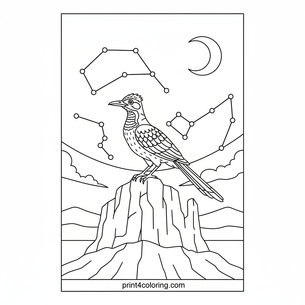 Imagine a magnificent roadrunner, a desert guardian, perched high on a rugged mesa. The night sky above twinkles with countless stars and a gentle crescent moon, highlighting intricate constellations. This expert-level page invites you to bring this magical desert night scene to life with your most vibrant colors and detailed shading.