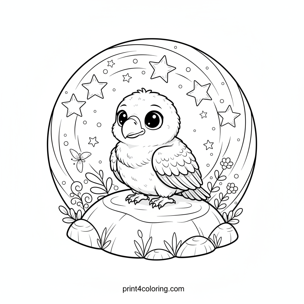 Imagine a majestic condor nestled peacefully on an ancient mountain peak, bathed in the soft glow of a starlit night. A gentle nebula paints the sky, while delicate, luminous plants twinkle around. This cozy sanctuary is a perfect scene for a magical coloring adventure, inviting you to add vibrant colors to its celestial beauty.