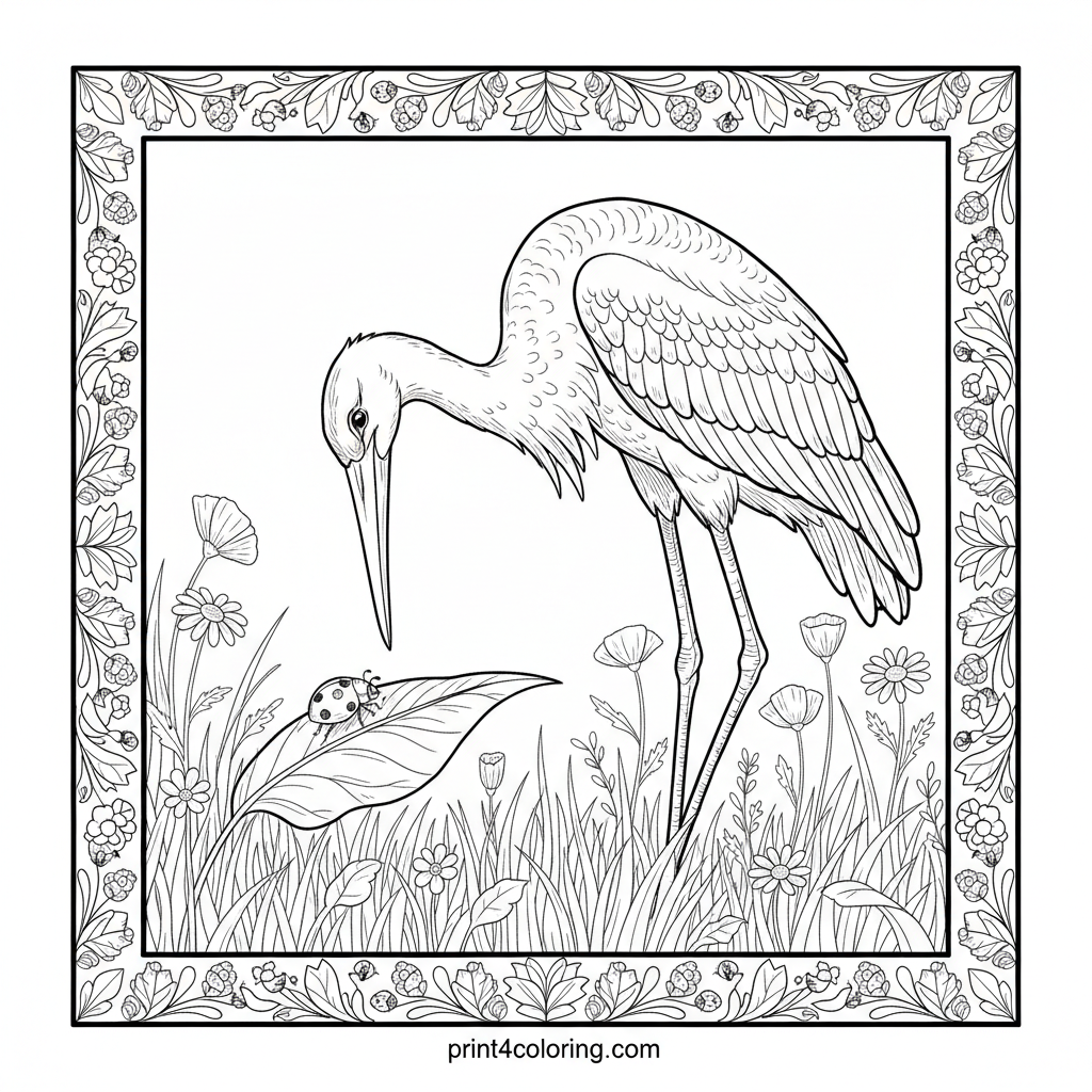 Stork's Gentle Gaze: A Ladybug Encounter Coloring Page