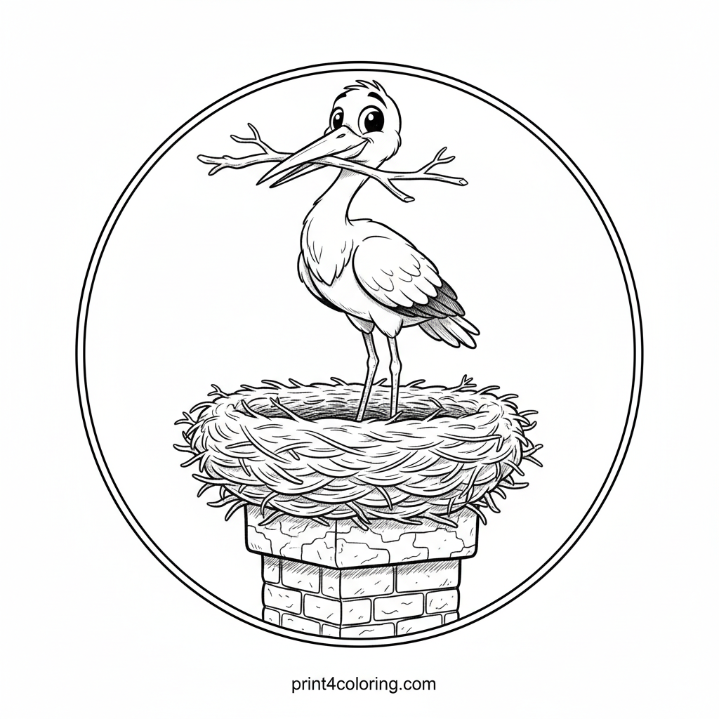 Watch a diligent stork masterfully balance an extra-long branch for its cozy nest, perched high on an old, detailed chimney. Its focused face and slightly tilted head show the effort. Add vibrant colors to the stork, its elaborate nest, and the rustic rooftop in this charming scene!
