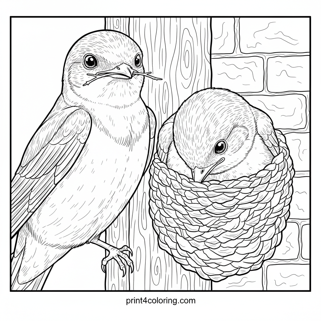 Witness the incredible teamwork of a swallow family! This detailed coloring page shows two adult swallows busily constructing their intricate mud-and-straw nest. One carries building materials, while the other carefully shapes the growing home against a textured wall. A beautiful scene of nature's dedicated builders.