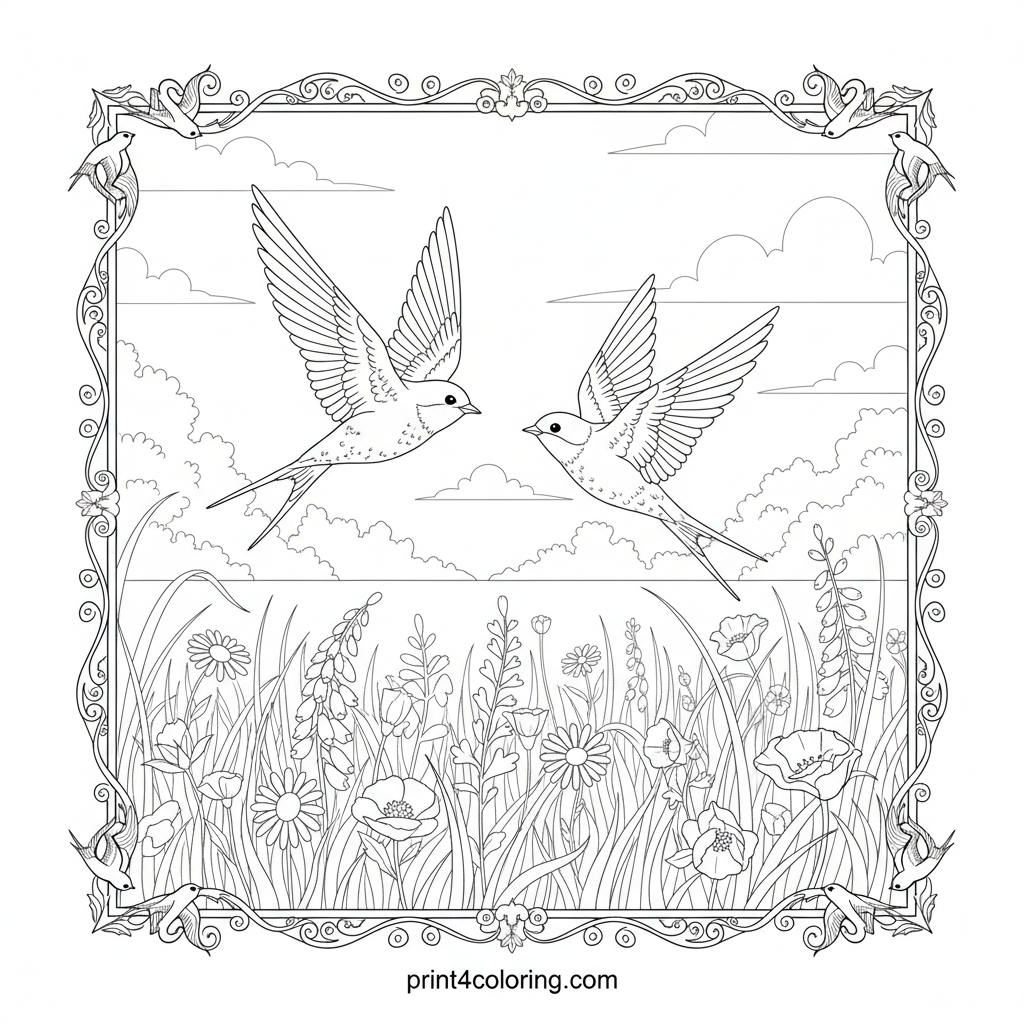 #swallows#birds#meadow#wildflowers#nature#flight#animals#expert#pattern-frame#coloring-page#printable