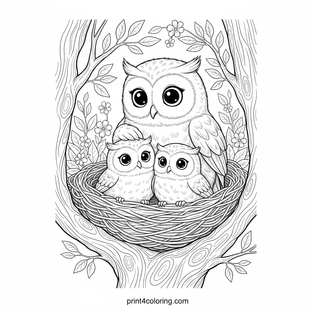 Snuggle into a heartwarming scene with a gentle mother owl tenderly caring for her two fluffy owlets in a cozy, sturdy nest. Explore the intricate details of the tree bark and leaves surrounding their peaceful home. A beautiful page to color and cherish!