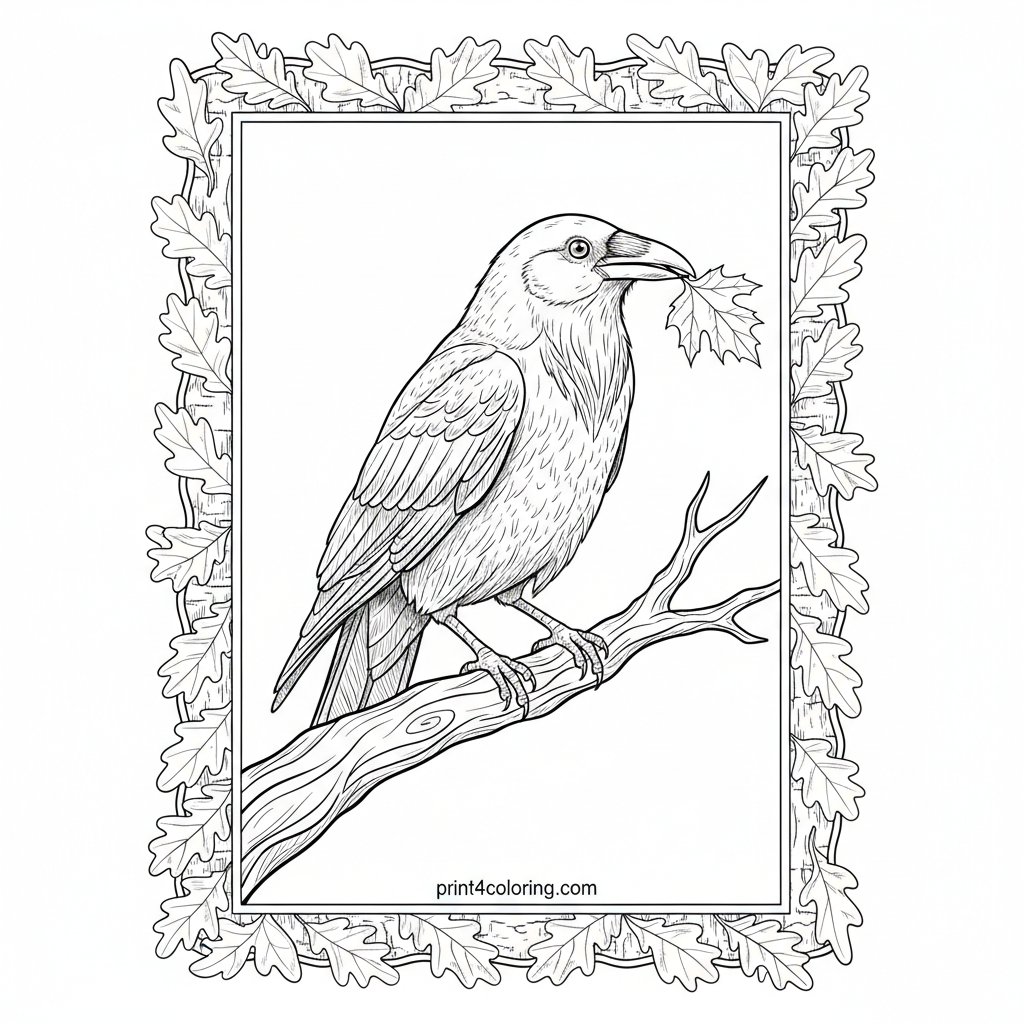Discover a magnificent crow, a true autumn connoisseur, delicately holding a brilliant fall leaf in its beak. This detailed scene features intricate tree bark textures and a backdrop of more realistic autumn foliage, inviting expert colorists to bring its seasonal beauty to life. A perfect challenge for those who love nature's fine details.