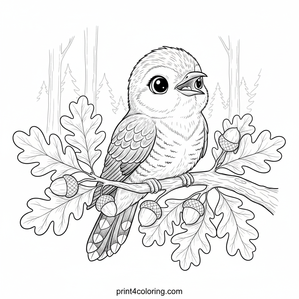 Immerse yourself in the tranquil beauty of the forest with this expert coloring page! A majestic cuckoo bird, beak open in song, perches on a gnarled oak branch, surrounded by intricate leaves and acorns. The deep woodland background invites you to bring this serene natural concert to life with your most vibrant colors.