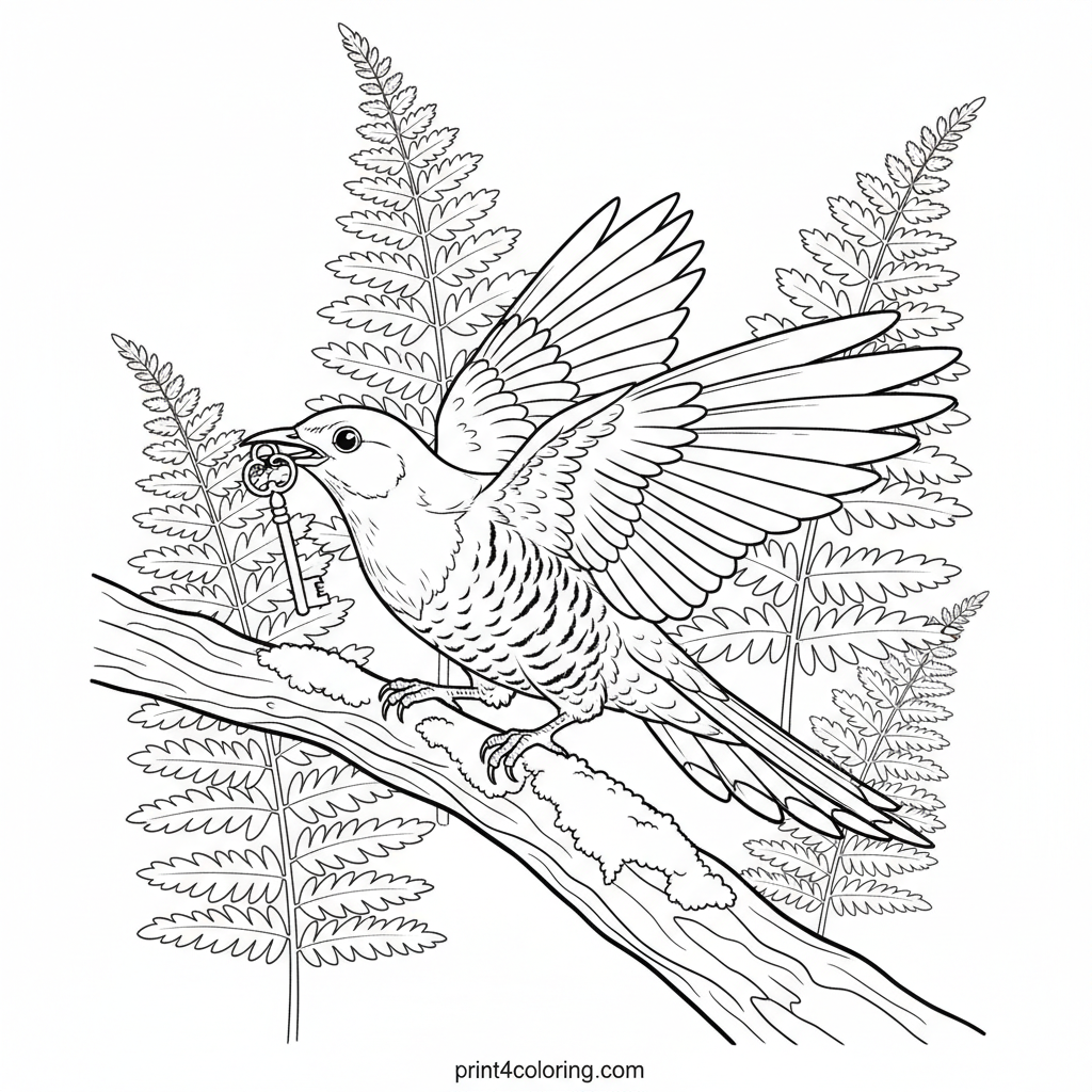 Join a sleek cuckoo on a magical journey! This detailed page shows the cuckoo delicately balancing a vintage key in its beak, perched on a mossy branch. Explore a mystical forest clearing with softly glowing ferns. A wondrous scene awaits your creative colors!