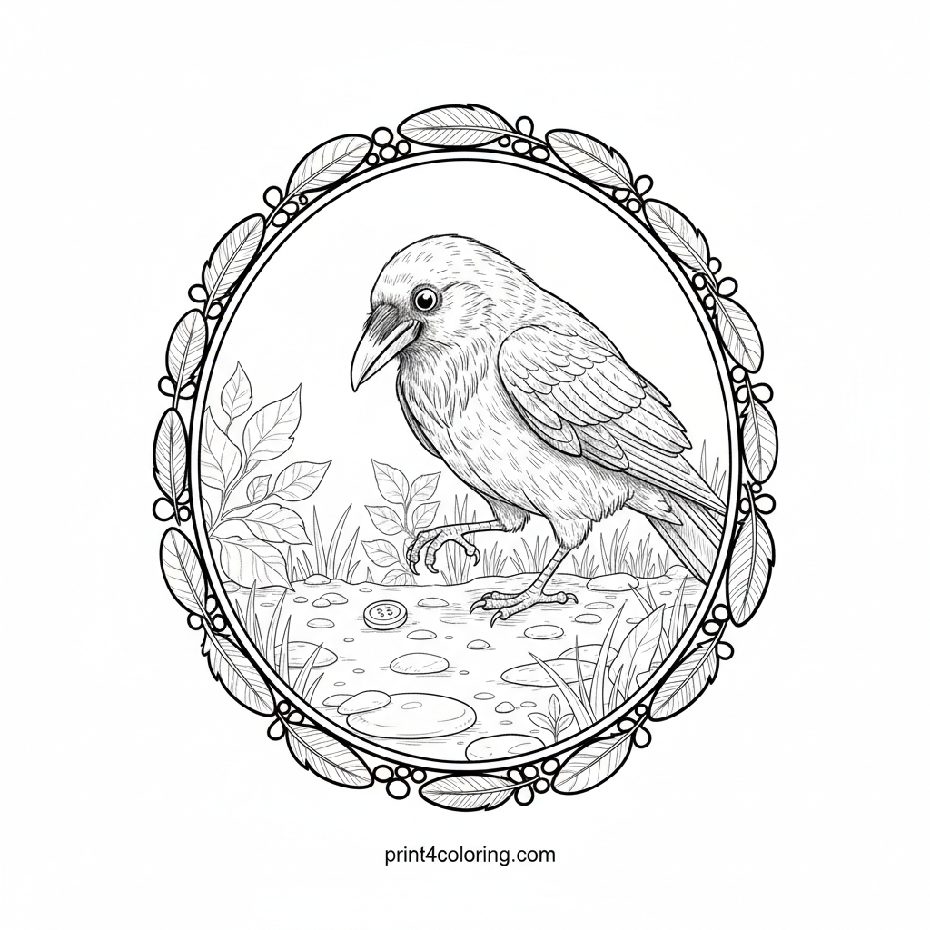 Join a clever crow as it discovers a fascinating shiny object on a peaceful garden path. Watch its head tilt with intense curiosity and its foot delicately reach out. This intricate scene, framed by beautiful garden foliage, invites you to bring its wonder to life with your favorite colors.
