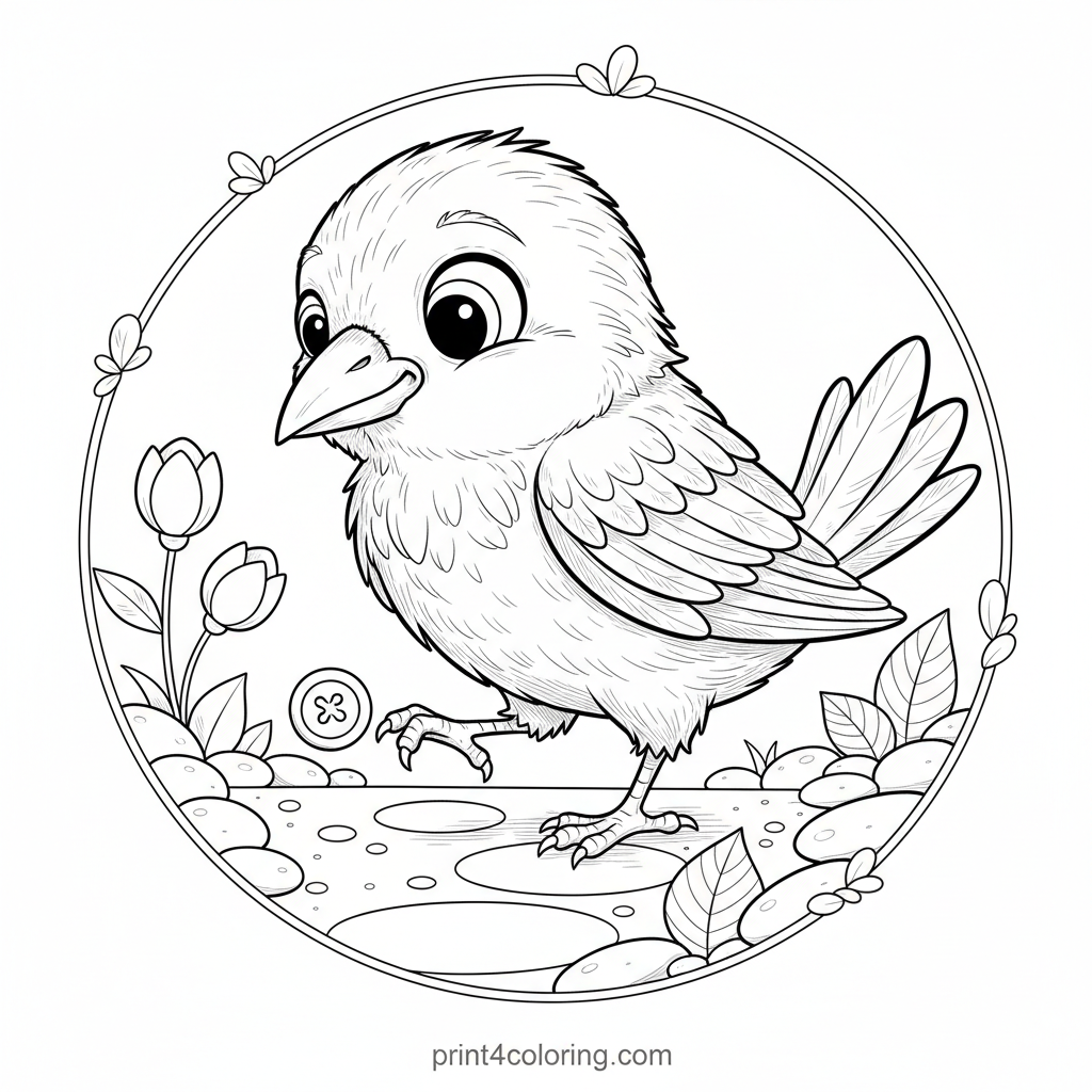 A clever crow tilts its head with intense curiosity, delicately investigating a tiny, sparkling treasure it found on a charming garden path. Surrounded by lush, realistic foliage and hidden wonders, this scene invites you to bring its discovery to life with your most vibrant colors. What exciting secret has our feathered friend uncovered?