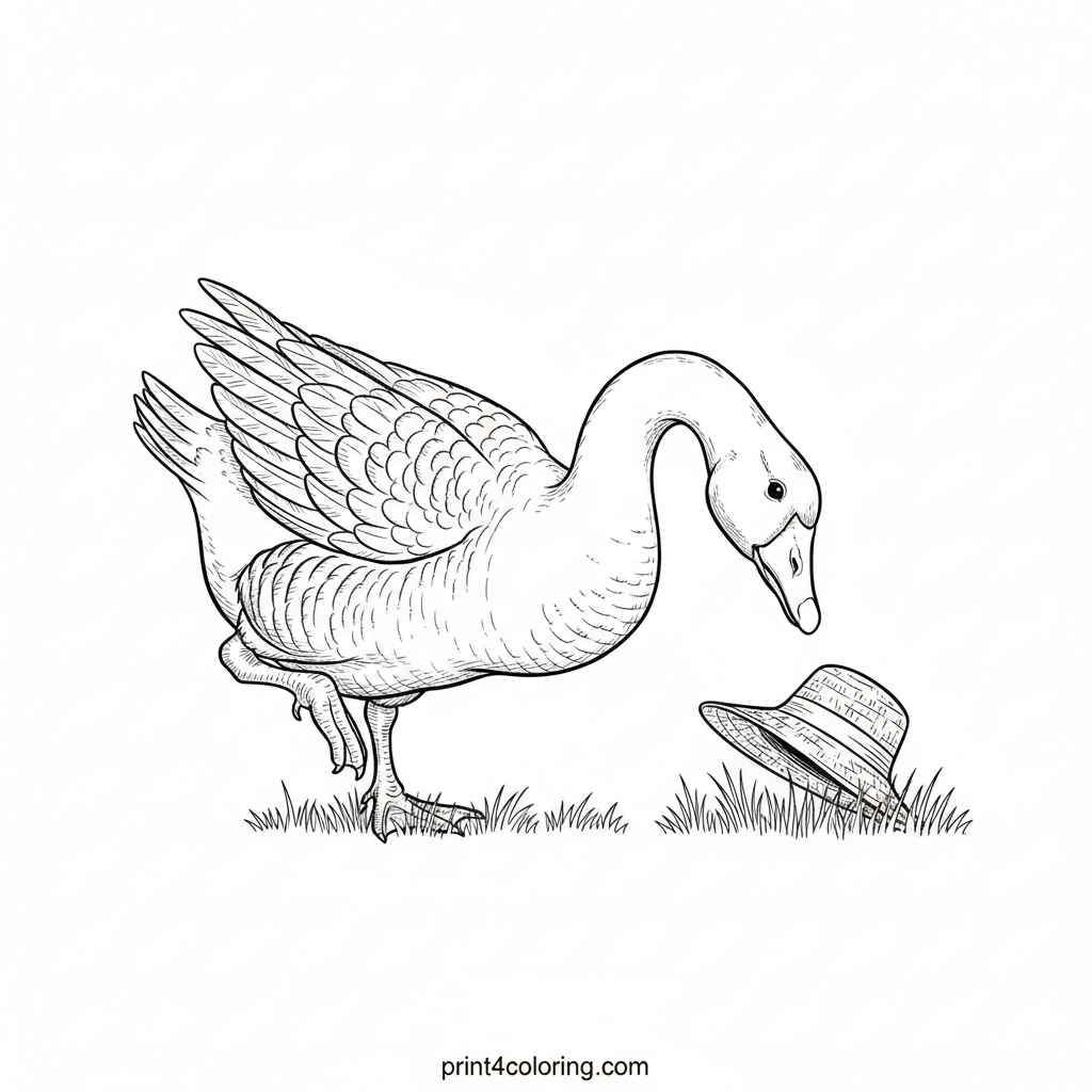 Discover a charming scene where a friendly goose, with every feather subtly outlined, tilts its head in gentle wonder. It's curiously examining a tiny, intricately woven straw hat resting on finely detailed grass. Use your colors to bring this inquisitive moment to life and imagine the goose's next adventure!
