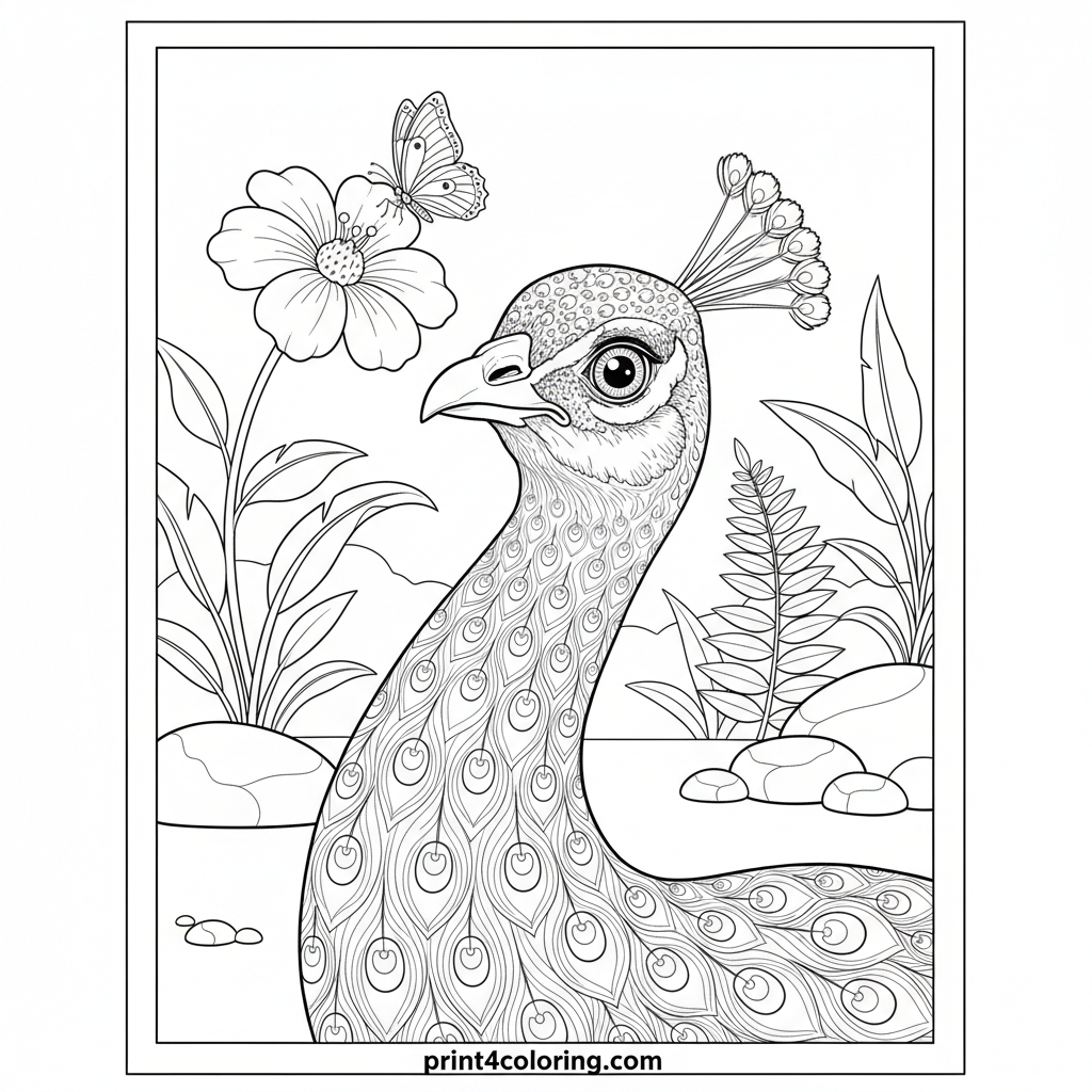 Step into a vibrant garden scene where a magnificent peacock, with its stunning tail gently lowered, observes a delicate butterfly. This detailed portrait captures the peacock's gentle curiosity as the tiny butterfly rests on a blooming flower, surrounded by lush plants and serene rocks. A truly intricate coloring challenge!