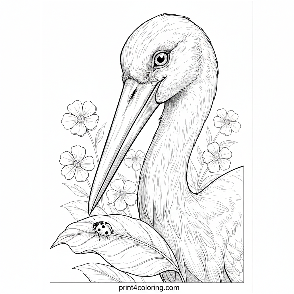Observe a magnificent stork with a gentle, curious expression, delicately bending its long neck to watch a tiny ladybug navigate a lush leaf. This expert coloring page beautifully captures the wonder of nature's contrasts, set amidst a vibrant field of detailed wildflowers. A charming scene for meticulous colorists.