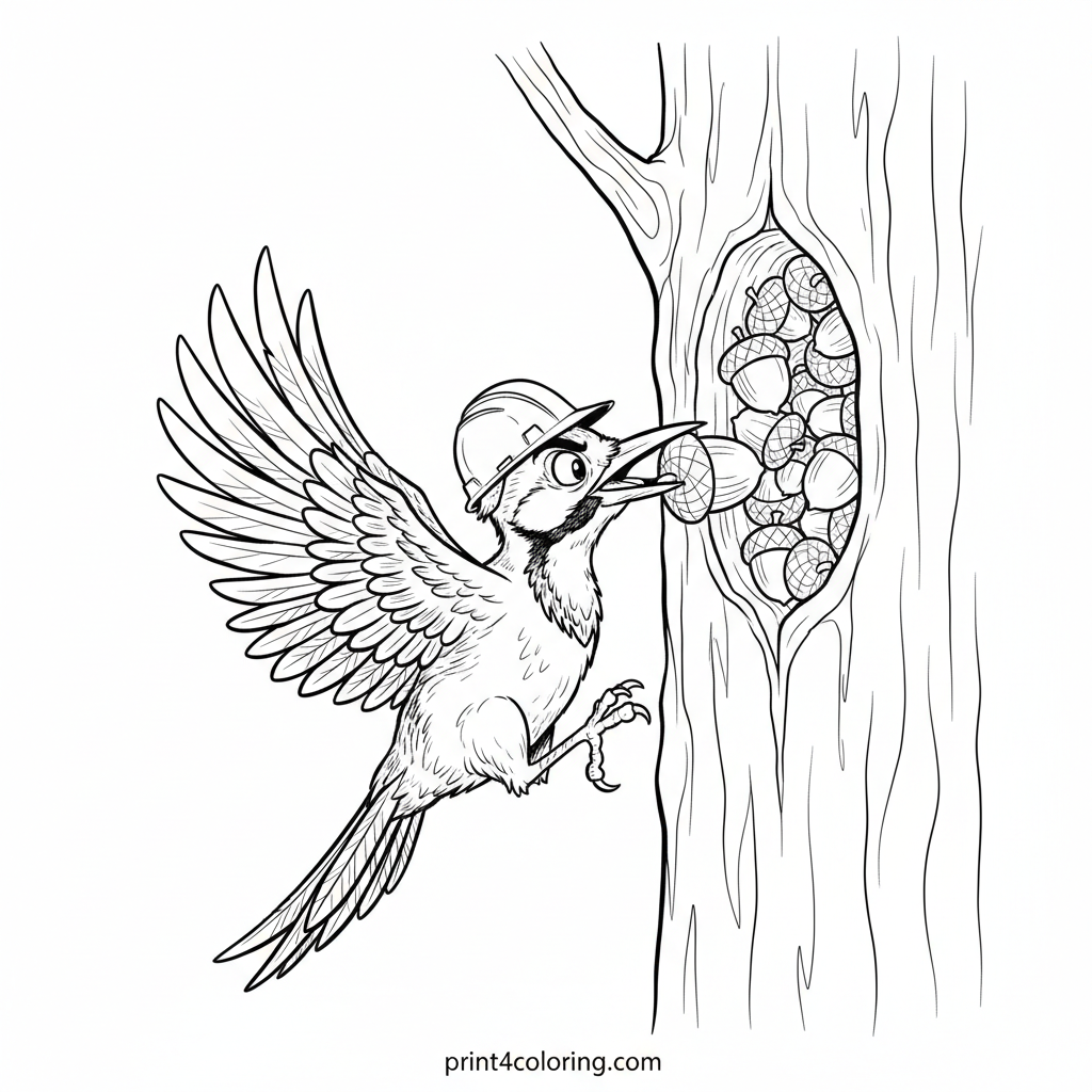Meet our comical Acorn Architect, a busy woodpecker with a tiny, askew construction helmet! Watch as this determined bird tries to fit an enormous acorn into a tree hole already overflowing with its winter stash. Color its focused, yet slightly bewildered, expression and the bounty of acorns!
