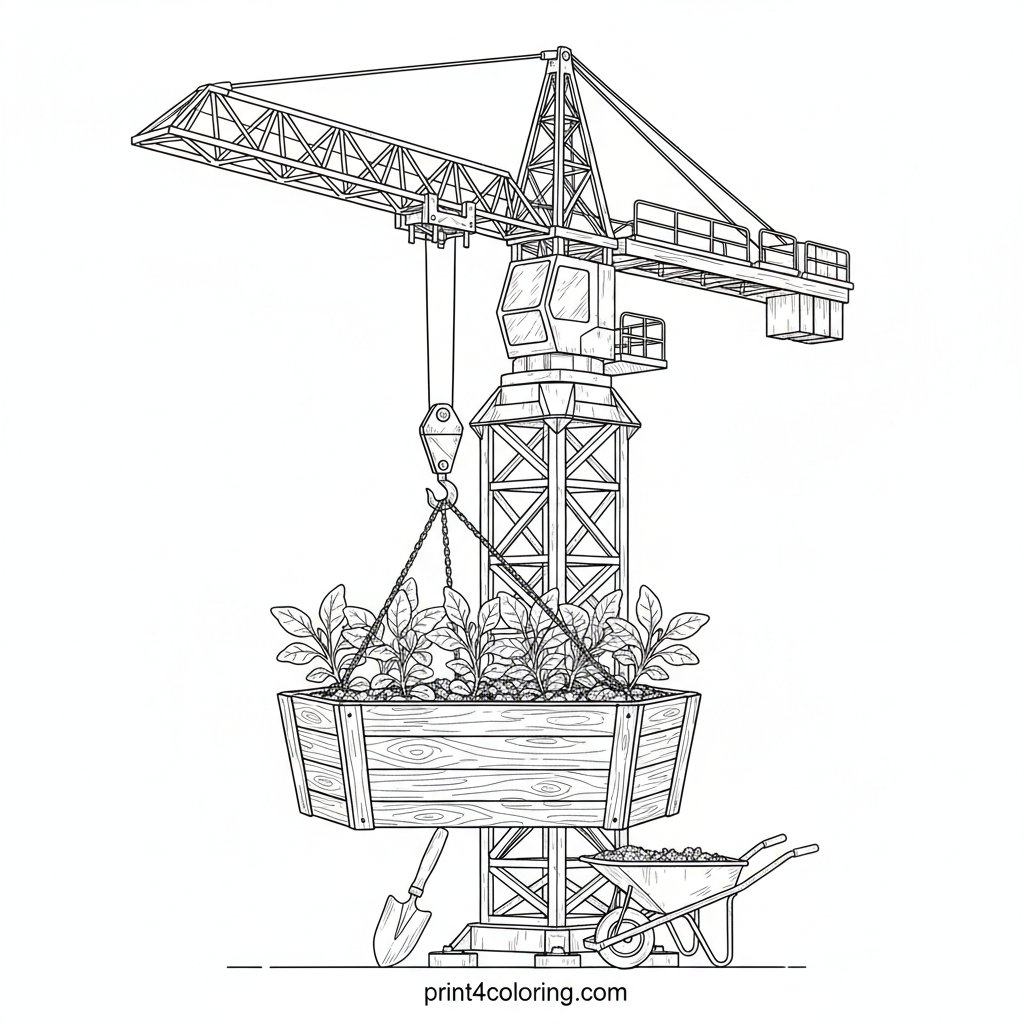 A mighty construction crane becomes a gentle giant, carefully placing a large wooden planter filled with soil and sprouts into a vibrant community garden. Discover detailed tools and a wheelbarrow nearby, ready for your colorful touch in this heartwarming scene of growth and teamwork.