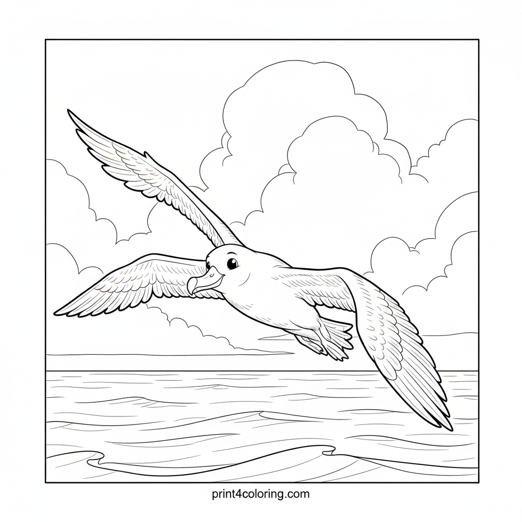 Soar high with a majestic albatross! This detailed coloring page features its impressive wings fully extended, showcasing every feather. Watch it glide effortlessly over a vast, turbulent ocean with crashing waves and a dramatic cloudy sky. Capture the power and grace of this incredible bird in an epic scene!