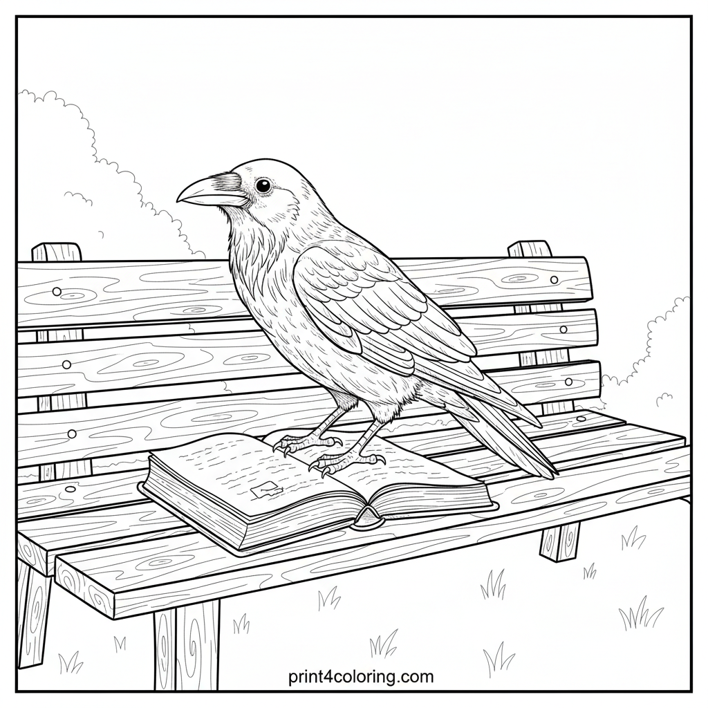 Discover a clever crow perched on a weathered park bench, seemingly lost in an open book! This detailed scene invites you to bring to life the intricate textures of the crow's feathers, the worn pages, and the aged wood. A delightful challenge for expert colorists, perfect for those who love nature and storytelling.
