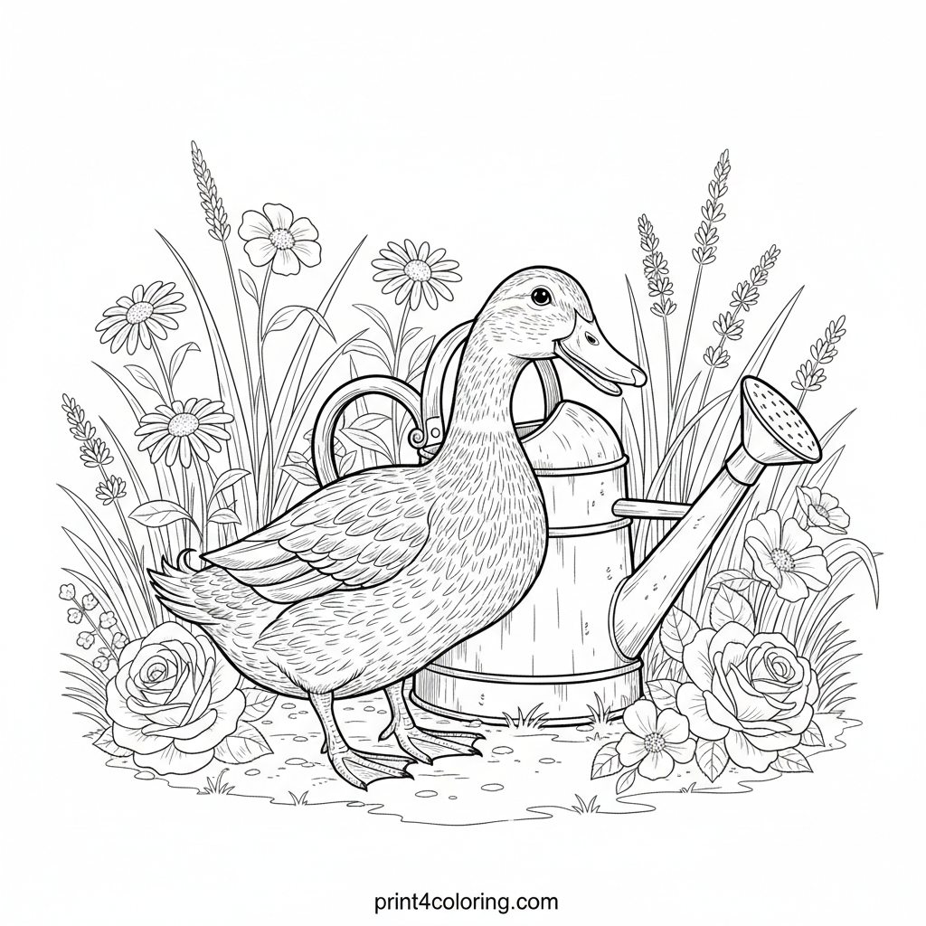 Waddle into a delightful garden scene where a charming duck, with a curious tilt of its head, peeks into a vintage metal watering can. Surrounded by beautifully blooming flowers and tall grasses, this sunlit moment captures a playful discovery. Perfect for expert colorists to bring to life!