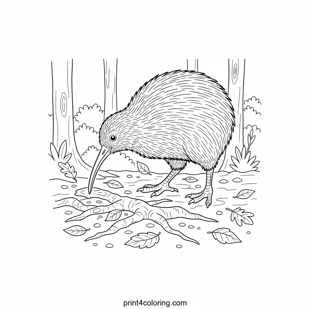 #kiwi-bird#nocturnal-animal#forest-scene#new-zealand#wildlife#night-scene#roots#leaves#foraging#coloring-page#printable