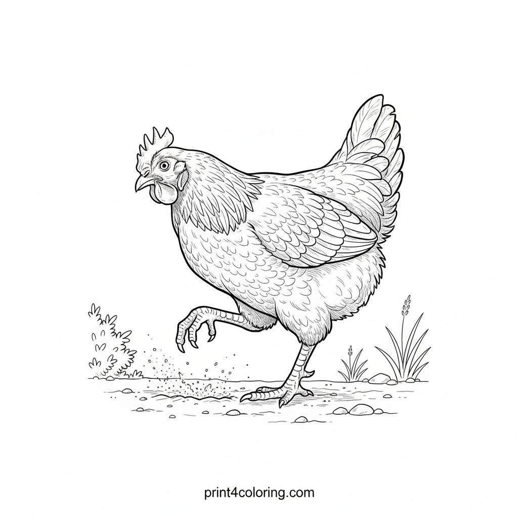 Meet Henrietta, the lively hen, busy scratching for tasty seeds and wriggly worms! Her feathers are ruffled, and a little dust puffs up as she digs with all her might. This detailed scene captures her energetic search, inviting you to add vibrant colors to her feathers and the rich earth. A farm adventure awaits!