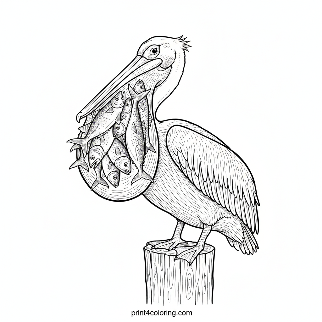 Picture a magnificent pelican, standing tall on a weathered pier post, its enormous pouch comically bulging with a fantastic haul of fish! This clever bird had an incredibly successful fishing trip and looks so satisfied with its bounty. Bring this bustling scene to life with your favorite colors, from shimmering fish scales to the sturdy wooden pier.