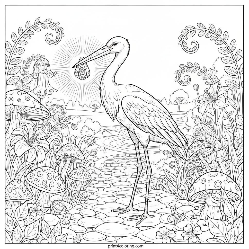 Did you know that storks are often seen as symbols of new beginnings and good fortune in many cultures, sometimes even delivering precious gifts or babies in folklore? This magical coloring page celebrates that wonder, imagining a stork bringing a very special, glowing seed to a secret garden!