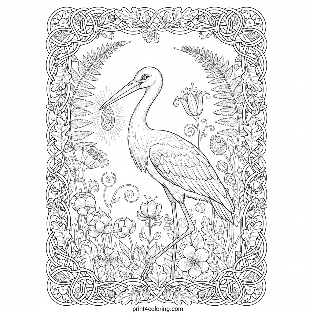 Dive into a magical secret garden where a majestic stork gently carries a single, glowing seed. This intricate scene features a frame of unusual botanical plants, shimmering dew drops, and a serene, enchanted atmosphere. Perfect for experienced colorists to bring to life with vibrant detail and magical hues.