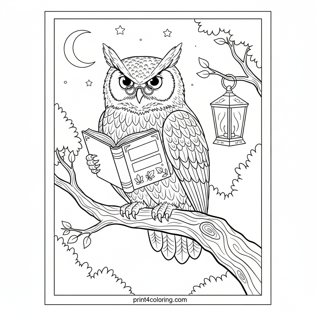 Witness a wise great horned owl, wearing tiny spectacles, deeply engrossed in a fascinating book. Perched on a sturdy branch with an antique lantern casting a warm glow, this detailed scene invites you to bring the quiet wisdom of the night to life. A perfect challenge for expert colorists!