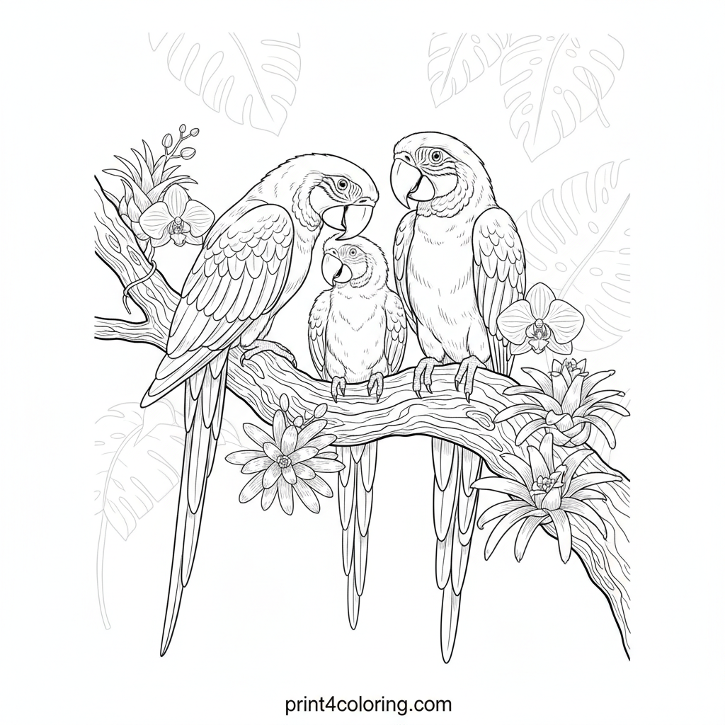 Vibrant Macaw Family on Orchid Branch Coloring Page