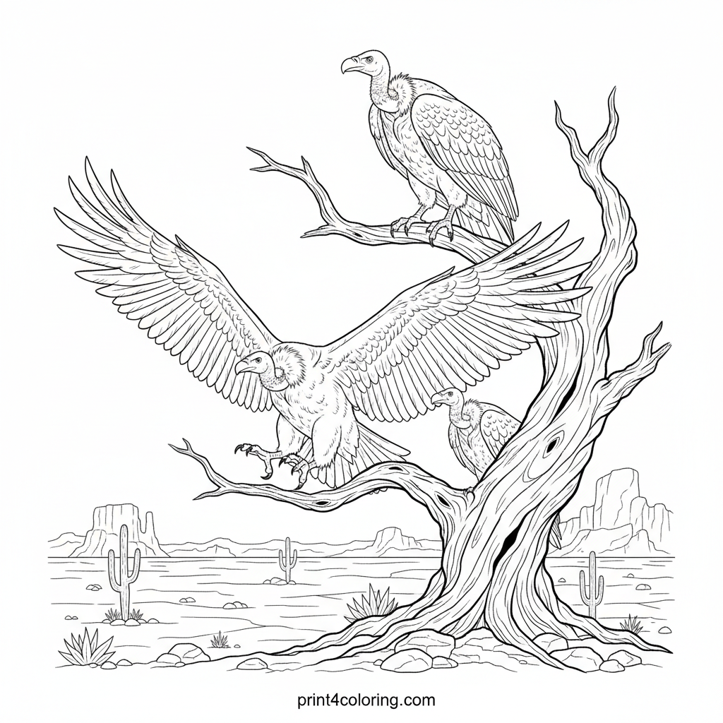 Imagine majestic vultures keeping watch from their ancient tree. Color their intricate feathers and the gnarled bark, then bring the vast desert landscape to life with your crayons. This detailed scene offers a challenge for expert colorists, inviting you to explore realistic textures and vast horizons.