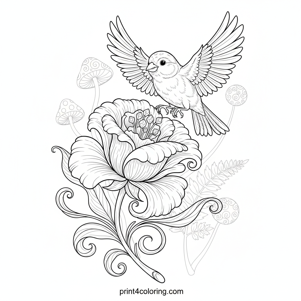 #canary#bird#flower#botanical#whimsical#secret-garden#fantasy#nature#detailed#coloring-page#printable