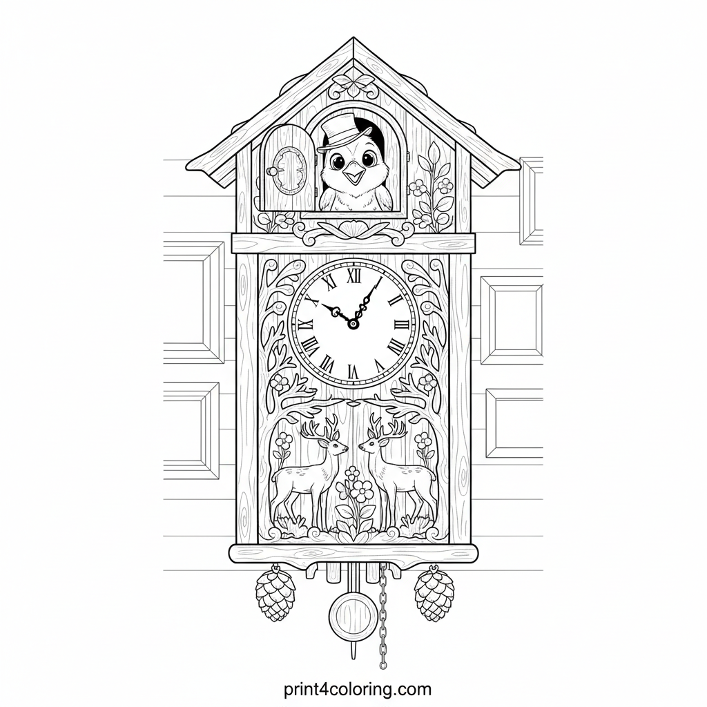 Discover a charming, vintage cuckoo clock adorned with delicate forest carvings. A friendly cuckoo bird, sporting a tiny, slightly askew top hat, peeks out with a surprised expression. Bring this intricate scene to life with your most vibrant colors, adding a touch of magic to every detail.
